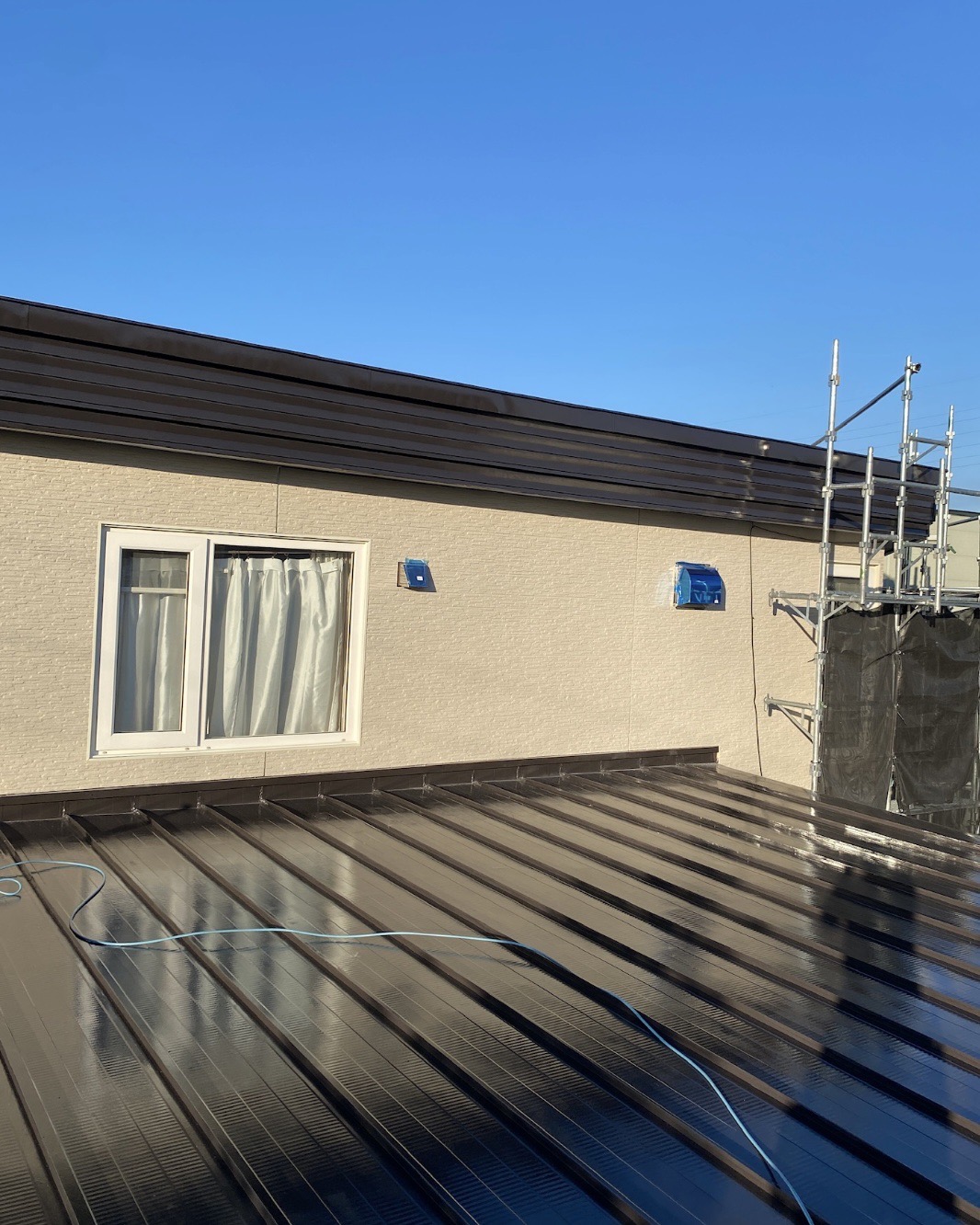 また、不陸調整には限度があります。しかし、画像の外装材のように凹凸が複雑に混ざったデザインは、波が目立ち難い特徴があります。